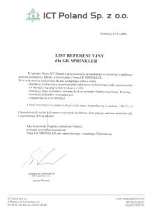 “W imieniu Firmy ICT Poland z przyjemnością zawiadamiam o wzorowej współpracy podczas rozbudowy fabryki w Kostrzynie z firmą GK SPRINKLER.