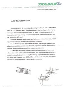 “TRASKO-INWEST SP. z o.o. ma przyjemność potwierdzić, że firma GK Sprinkler Polska SP. z o.o. Oddział Legnica wykonała w bieżącym roku, instalację tryskaczową i hy-drantową na obiekcie Centrum Dystrybucyjnego dla TZMO w Toruniu na wartość ok. 1.5 mln. złotych, wygrywając przetargi wewnętrzne dzięki swojej elastyczności cenowej z wie-loma renomowanymi firmami.